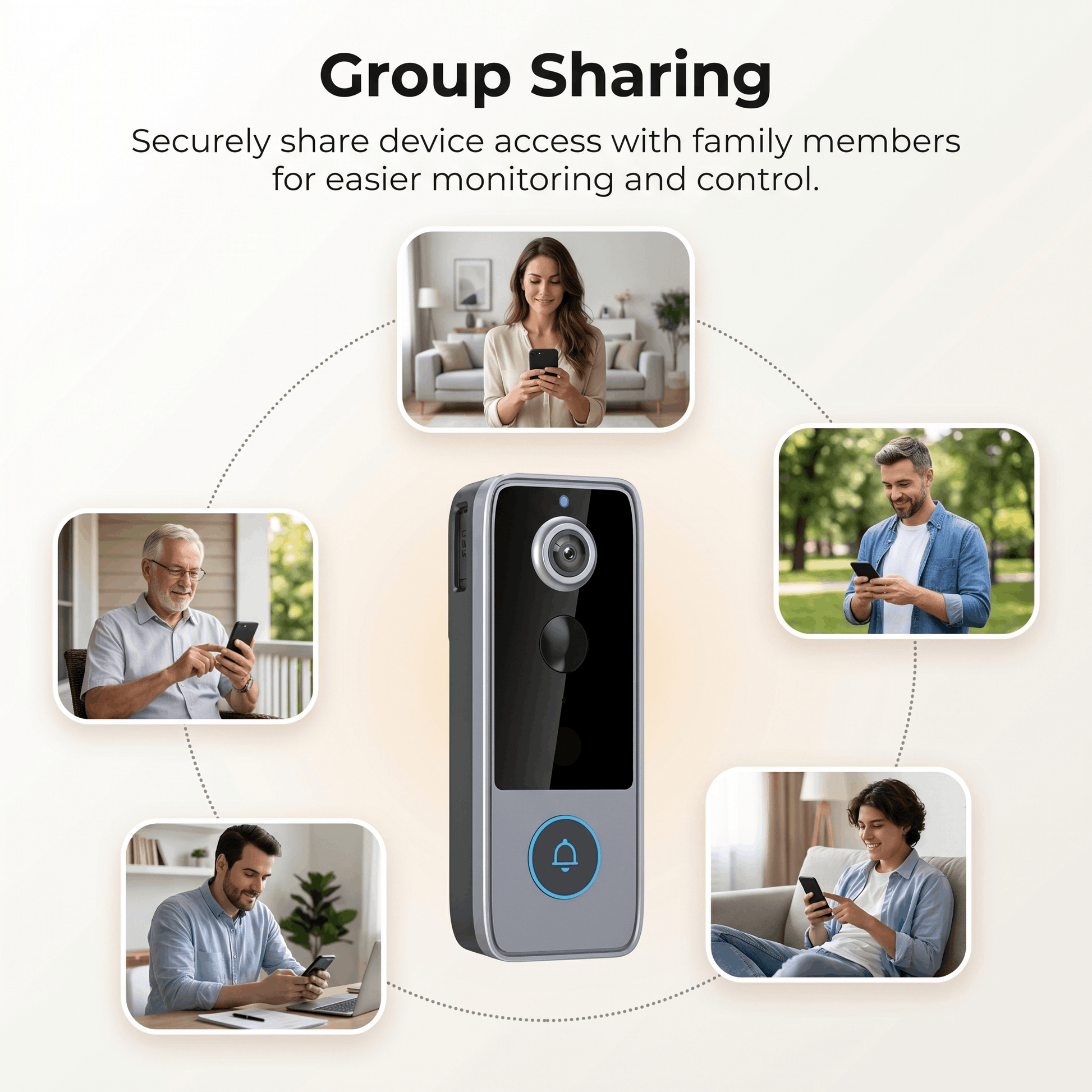 Share device access with everyone in your household for collaborative home monitoring. The Marcherelle Camera Doorbell's group sharing feature keeps the whole family connected and informed, delivering comprehensive security and true peace of mind.